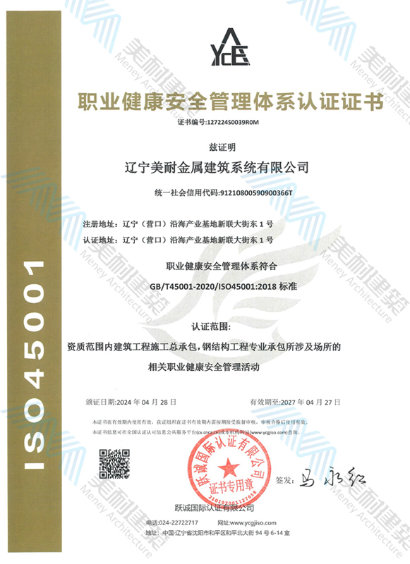 遼寧美耐金屬建筑系統有限公司位于遼寧(營口)沿海產業基地,專注于預制金屬建筑系統領域,是一家集工業建筑設計、制作、施工及相關的技術咨詢與服務為一體的綜合性服務企業。作為國家鋼結構協會會員、中國建筑金屬結構協會會員單位與國家高新技術企業,美耐建筑集建筑工程施工總承包、鋼結構工程專業承包等多種資質于一身,并擁有22項鋼結構建筑領域專利,9項軟件著作權。
